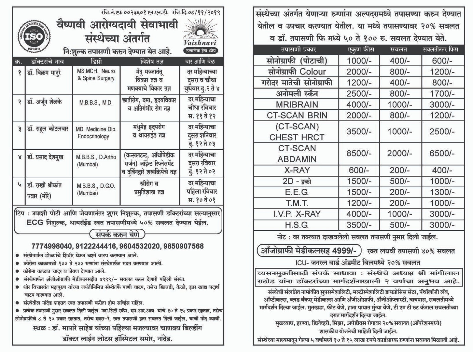 Vaishnavi Arogyadayi Seva Bhavi Sanstha has proudly served thousands of patients through affordable and accessible medical services. Under the guidance of expert doctors across multiple specialties such as neurosurgery, endocrinology, orthopedics, and gynecology, our organization continues to bridge healthcare gaps in underserved regions.